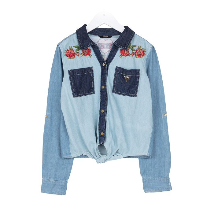 Блуза Guess – это идеальный выбор для девочек! Изготовленная из 100% хлопка, она украшена вышивкой красных роз и карманами из джинсовой ткани. Нежная джинсовая основа с яркими красными розами и зелеными листьями создает элегантный и в то же время уютный образ. На фотографии видны аккуратные карманы из джинса, золотые пуговицы и вышивка роз. Качество от бренда из Индии и внимание к деталям делают эту блузу отличным выбором для вашего ребенка!
