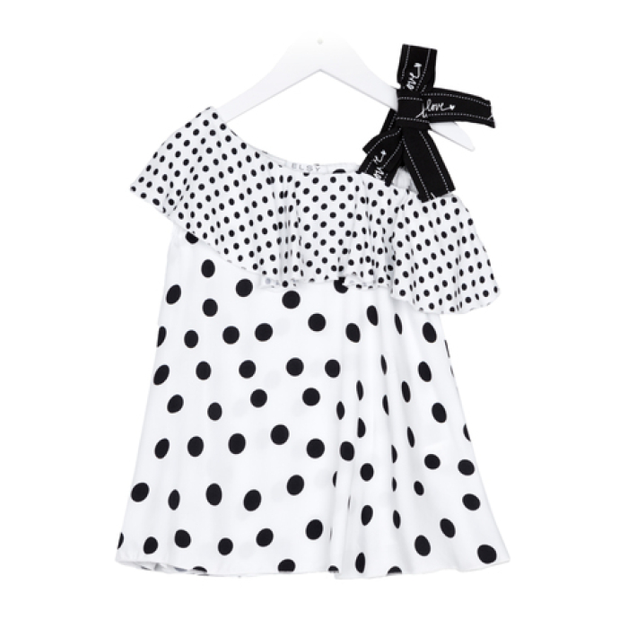 Блуза Elsy – это идеальный выбор для маленьких модниц! Изготовленная из 100% вискозы, она украшена очаровательным принтом черных горохов и оборкой на плечах. Нежная белая основа с черными горохами и оборками создает стильный и в то же время уютный образ. На фотографии видна аккуратная черная оборка на плечах и элегантный принт горохов. Качество от бренда из Италии и внимание к деталям делают эту блузу отличным выбором для вашего ребенка!