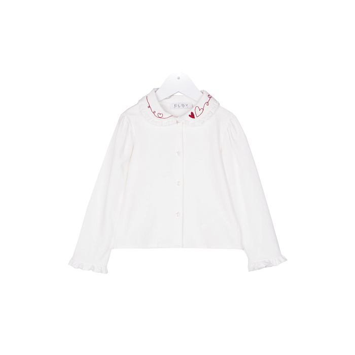 Блуза тр. Elsy – это идеальный выбор для девочек! Изготовленная из 95% хлопка и 5% эластана, она украшена оригинальным принтом в виде сердец и рюшами. Белая основа с красными сердечками и рюшами создает нежный и романтичный образ. На фотографиях видны аккуратные рюши по краю воротника и рукавов, а также красные сердечки на белом фоне. Качество от бренда из Китая и внимание к деталям делают эту блузу отличным выбором для вашего ребенка!