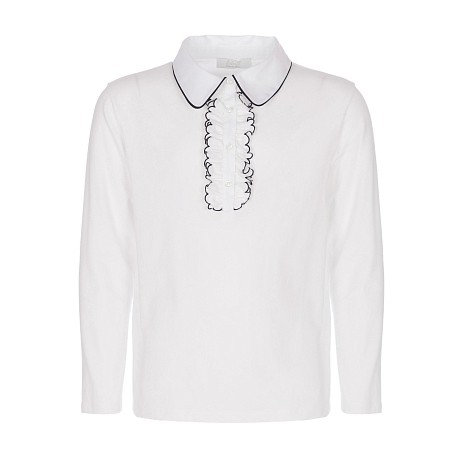 Белая блузка для девочек от Ella B. – это идеальный выбор для стильных и комфортных образов! Изготовлена из 96% хлопка и 4% эластана, она обеспечивает мягкость и эластичность. Воротник на пуговицах и рюшами на груди делают эту блузку не только удобной, но и очень элегантной. На фотографиях видна аккуратная черная контрастная окантовка по краю воротника и рюшами на груди. Качество от бренда Ella B. и внимание к деталям делают эту блузку отличным выбором для вашего ребенка!