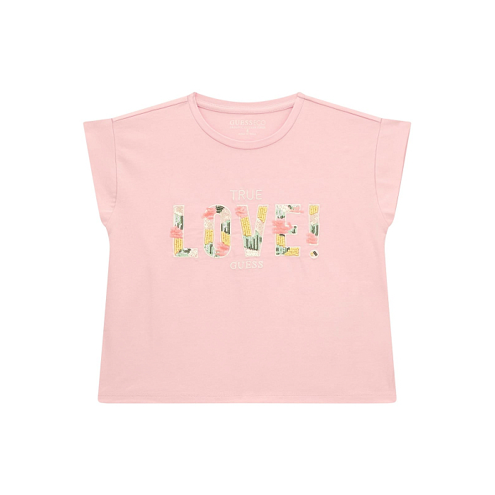 Футболка Guess с принтом True Love – это идеальный выбор для девочек от 7 до 12 лет! Изготовлена из 95% хлопка и 5% эластана, она идеально подходит для детей разных возрастов. Футболка украшена блестящим принтом True Love, который добавляет яркости и веселья. На фотографиях видна аккуратная вышивка блестками по всему принту, а также мягкая и приятная на ощупь ткань. Качество от американского бренда Guess и внимание к деталям делают эту футболку отличным выбором для вашего ребенка!