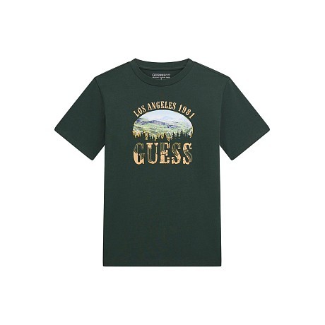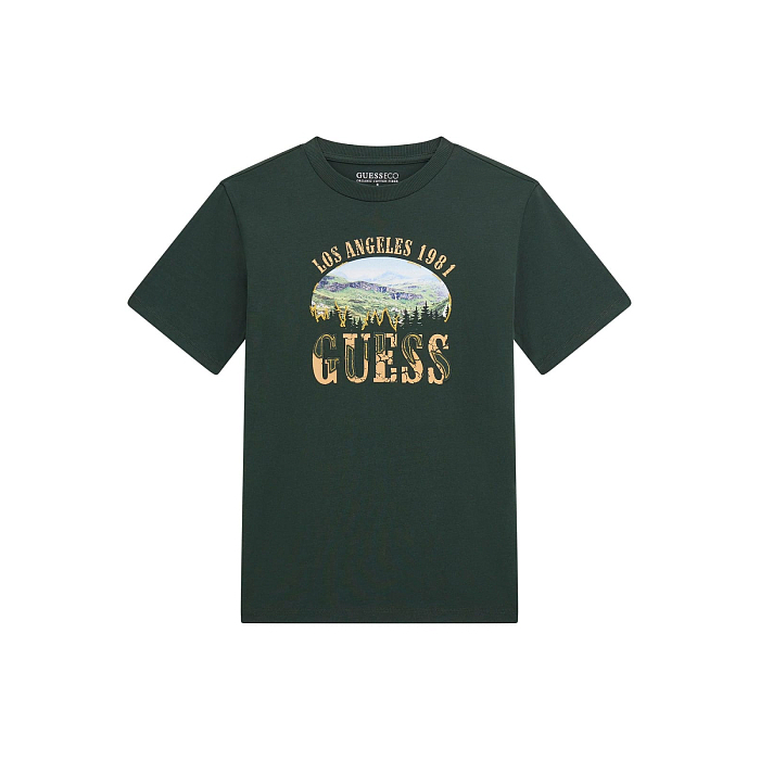 Футболка Guess – это идеальный выбор для мальчиков! Изготовлена из 100% хлопка, она украшена ярким принтом Los Angeles 1984 с изображением гор, леса и надписью Guess. Нежная зеленая основа с контрастными элементами создает стильный и уютный образ. На фотографиях видна аккуратная окантовка по краю и мягкая текстура ткани. Качество от американского бренда Guess делает эту футболку отличным выбором для вашего ребенка!