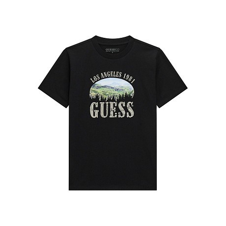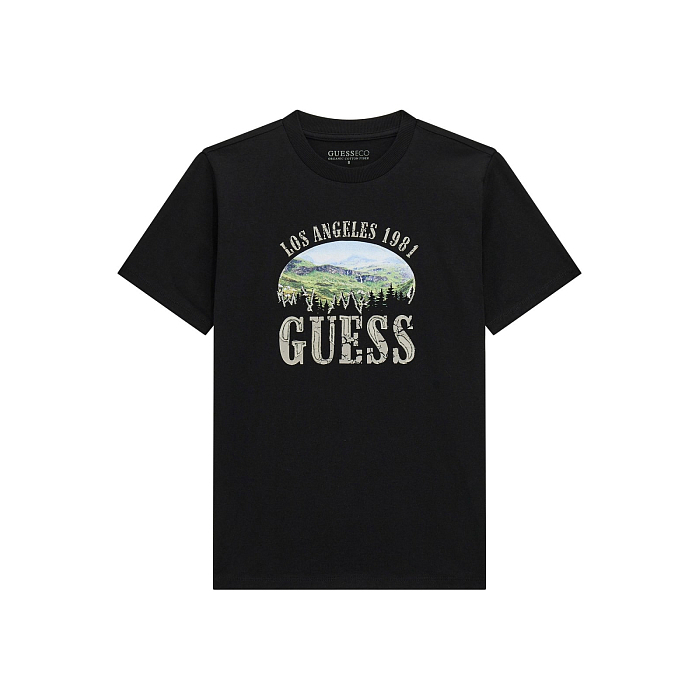 Футболка Guess – это идеальный вариант для мальчиков! Изготовлена из 100% хлопка, она украшена оригинальным принтом Los Angeles 1981 с изображением гор, леса и надписью "Los Angeles 1981". Чёрная основа с ярким принтом создает неповторимый стиль и комфорт. На фото видна аккуратная окантовка по краю и мягкая текстура ткани. Качество от американского бренда Guess обеспечивает долговечность и комфорт.
