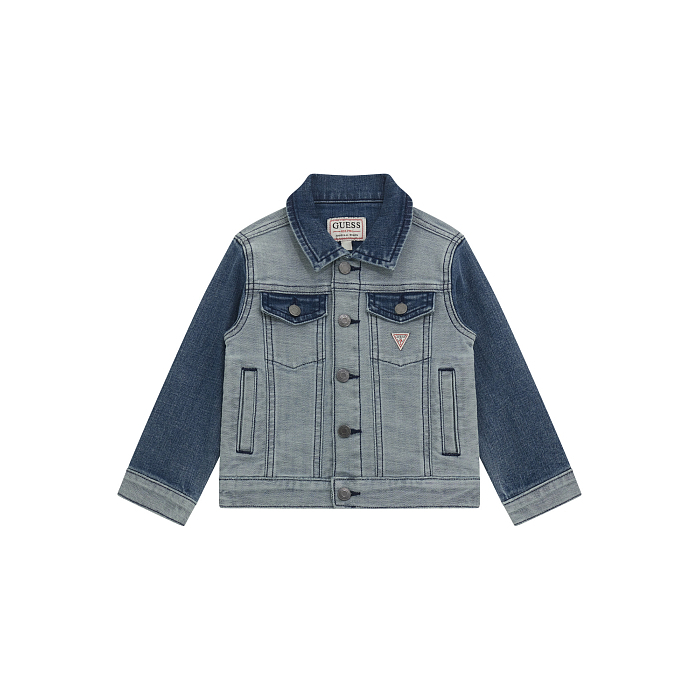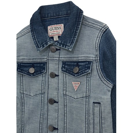 - 🎨 Дизайн: темно-синий цвет, застежка на пуговицы, карманы с клапанами, эмблема Guess, логотип на рукаве