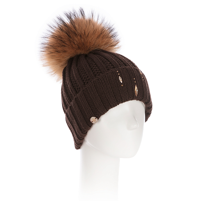 Шапка для девочек коричневая с мехом енота