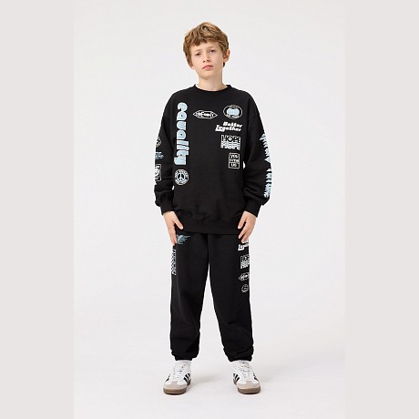 Мужские брюки тр. Molo черного цвета – это идеальный выбор для активных детей! Изготовленные из 100% натурального хлопка, они украшены стильными надписями и принтами. Нежная черная основа с яркими белыми и синими акцентами создает современный и модный образ. На фотографиях видны аккуратные белые и синие надписи, а также контрастная белая окантовка по краю. Качество от бренда из Дании и внимание к деталям делают эти брюки отличным выбором для вашего ребенка!