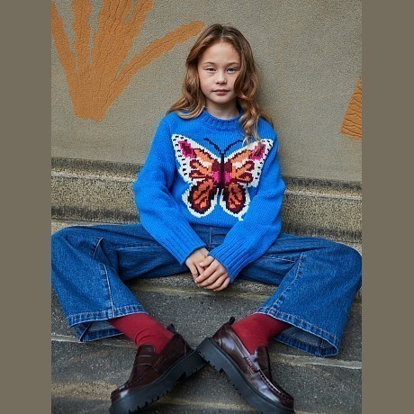 Джемпер для девочек Molo – это идеальный выбор для осенних и зимних дней! Изготовленный из 60% шерсти и 40% акрила, он украшен ярким принтом бабочки с разноцветными крыльями. Синий фон создает ощущение легкости и радости, а акрил и шерсть обеспечивают отличную теплоту и мягкость. На фотографиях видна аккуратная резинка по краю и ровная вязка ткани. Качество от датского бренда и внимание к деталям делают этот джемпер отличным выбором для вашего ребенка!