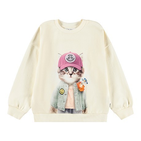 Джемпер для девочек Molo – это идеальный выбор для маленьких модниц! Изготовлен из 100% натурального хлопка, он украшен очаровательным принтом с котенком, который одет в кепку и кардиган. Милый молочный цвет создает нежное и приятное настроение. На фотографиях видна аккуратная кружевная окантовка по краю и мягкая текстура ткани. Качество от бренда из Дании и внимание к деталям делают этот джемпер отличным выбором для вашего ребенка!