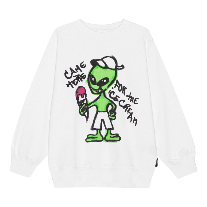 Джемпер Molo – это идеальный выбор для юных модников! Изготовленный из 100% натурального хлопка, он украшен очаровательным принтом зеленого пришельца, держащего мороженое. Белая основа с ярким зеленым пришельцем и розовым мороженым создает игривое и веселое настроение. На фотографиях видна аккуратная белая окантовка по краю и мягкая текстура ткани. Качество от бренда из Дании и внимание к деталям делают этот джемпер отличным выбором для вашего мальчика!