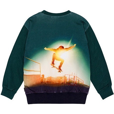 Джемпер Molo – это идеальный выбор для юных скейтбордистов! Изготовленный из 100% натурального хлопка, он украшен ярким принтом с изображением скейтбордиста, выполняющего трюк на скейт-парке. Темно-зеленый цвет создает стильный и современный образ. На фотографиях видна аккуратная окантовка по краю и мягкая текстура ткани. Качество от бренда из Дании и внимание к деталям делают этот джемпер отличным выбором для вашего ребенка!
