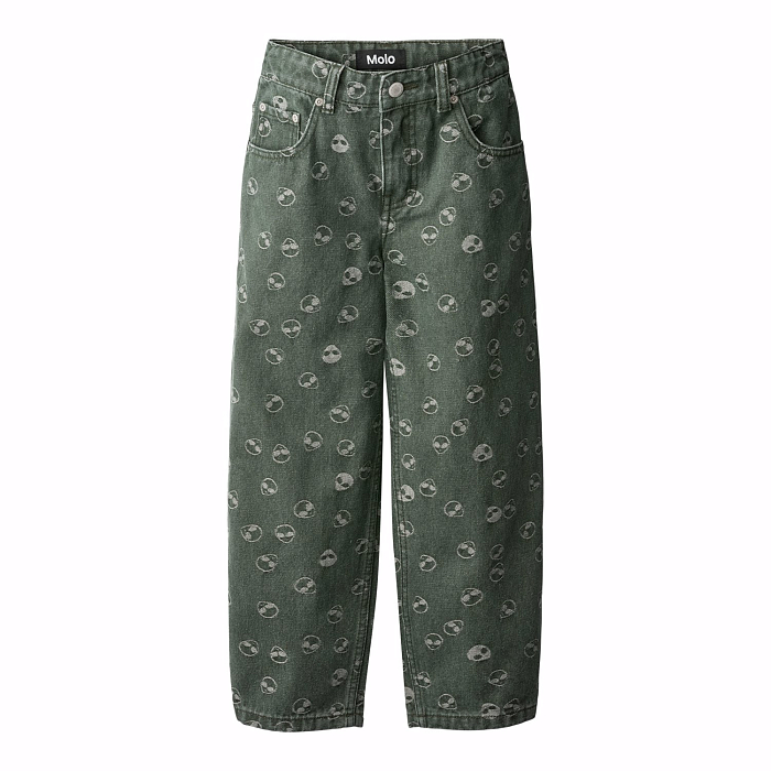 Джинсы Molo – это стильный выбор для вашего юного модника! Изготовленные из 90% хлопка и 10% эластана, они украшены забавными принтами пришельцев. Нежный зеленый цвет с серыми пришельцами создает неповторимый и модный образ. На фотографиях видна аккуратная застежка на пуговицах и удобная посадка. Качество от бренда из Дании и внимание к деталям делают эти джинсы отличным выбором для вашего ребенка!