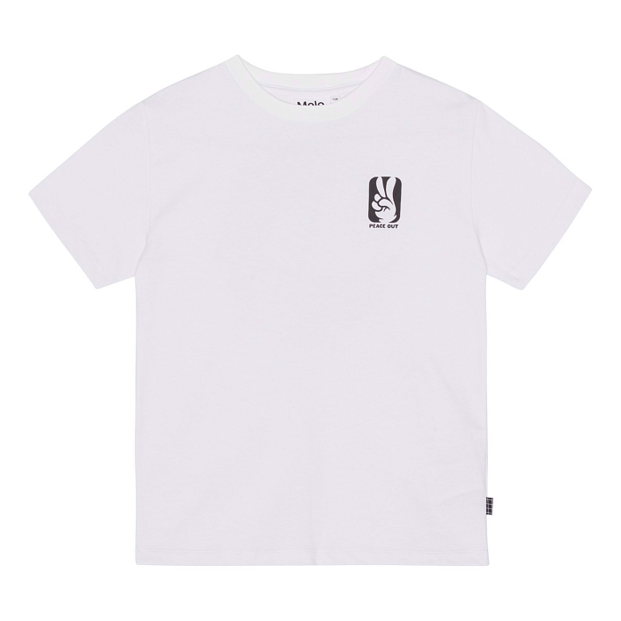Футболка Molo – это идеальный выбор для мальчиков! Изготовленная из 100% натурального хлопка, она украшена оригинальным принтом руки с надписью Peace Out. Белая основа с черным принтом создает стильный и неповторимый образ. На фотографиях видна аккуратная черная контрастная окантовка по краю и мягкая текстура ткани. Качество от бренда из Дании и внимание к деталям делают эту футболку отличным выбором для вашего ребенка!