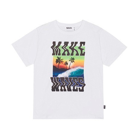 Футболка Molo – это идеальный выбор для юных моряков! Изготовленная из 100% натурального хлопка, она украшена ярким принтом с пальмами и надписью "Make Waves". Белый цвет основы с яркими пальмами и океаном создает легкое и позитивное настроение. На фотографиях видна аккуратная вышивка бренда Molo на воротнике и мягкая текстура ткани. Качество от датского бренда и внимание к деталям делают эту футболку отличным выбором для вашего мальчика!