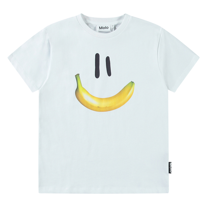 Футболка Molo – это идеальный выбор для детей! Изготовленная из 100% натурального хлопка, она украшена очаровательным принтом банана с улыбкой. Белая основа с ярким желтым бананом создает легкое и веселое настроение. На фотографиях видна аккуратная круглая горловина и мягкая текстура ткани. Качество от бренда из Дании и внимание к деталям делают эту футболку отличным выбором для вашего ребенка!