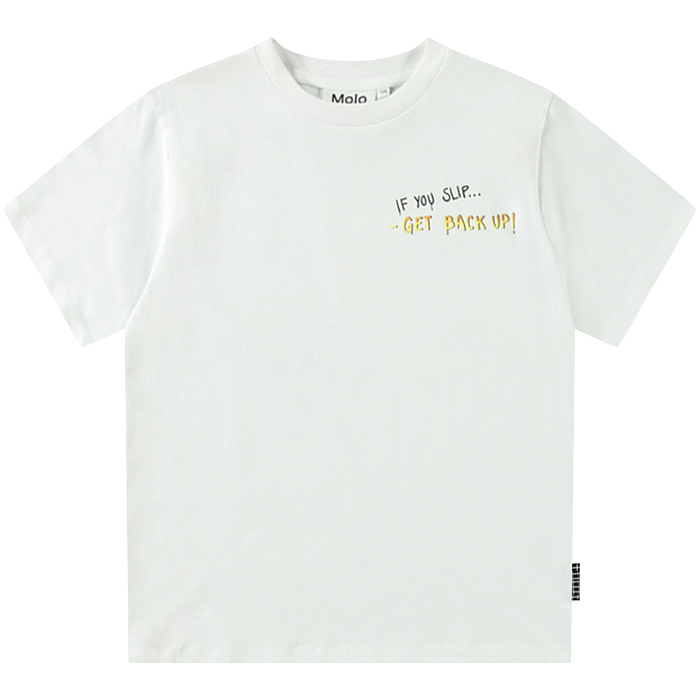 Футболка Molo – это идеальный выбор для юных модников! Изготовленная из 100% натурального хлопка, она украшена забавным принтом бананов и надписью "If you slip... Get back up!". Белая основа с яркими бананами и черной надписью создает неповторимый стиль и в то же время подчеркивает смелость и уверенность. На фотографиях видна аккуратная вышивка по краю и мягкая текстура ткани. Качество от бренда из Дании и внимание к деталям делают эту футболку отличным выбором для вашего мальчика!