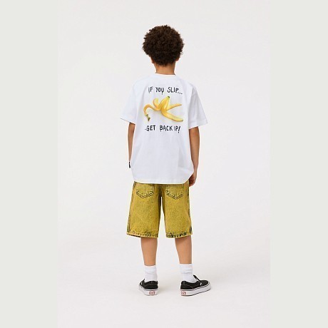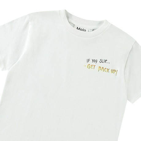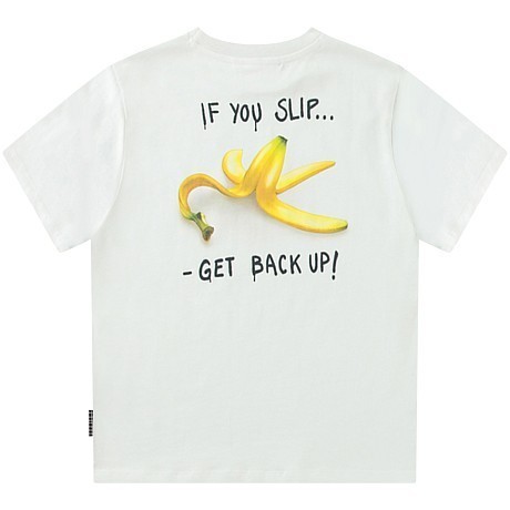 Футболка Molo – это идеальный выбор для юных модников! Изготовленная из 100% натурального хлопка, она украшена забавным принтом бананов и надписью "If you slip... Get back up!". Белая основа с яркими бананами и черной надписью создает неповторимый стиль и в то же время подчеркивает смелость и уверенность. На фотографиях видна аккуратная вышивка по краю и мягкая текстура ткани. Качество от бренда из Дании и внимание к деталям делают эту футболку отличным выбором для вашего мальчика!