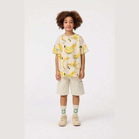 Футболка для мальчиков Molo светло-бежевого цвета с забавным принтом бананов – идеальный выбор для активных детей! Изготовлена из 100% натурального хлопка, который обеспечивает комфорт и гипоаллергенность. Принт бананов с яркими зелеными листьями и небольшими синими этикетками создает веселое и яркое настроение. На фотографиях видны аккуратные детали вышивки логотипа Molo на воротнике и мягкая текстура ткани. Качество от датского бренда и внимание к деталям делают эту футболку отличным выбором для вашего ребенка!
