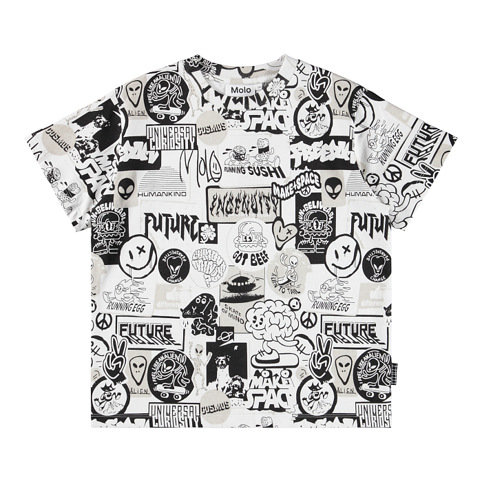 Футболка Molo – это идеальный выбор для юных модников! Изготовленная из 100% натурального хлопка, она украшена забавным принтом с черно-белыми мотивами, словами и изображениями. Серый цвет основы с яркими черными элементами создает модный и в то же время нейтральный наряд. На фотографиях видны различные граффити, улыбки, монстрики и другие детали, которые делают эту футболку необычной и привлекательной. Качество от датского бренда Molo и внимание к деталям делают эту футболку отличным выбором для вашего ребенка!