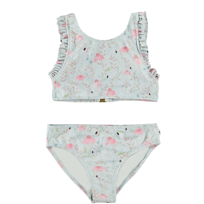 Двухпредметный купальник для девочки Molo – идеальный выбор для теплых дней! Изготовлен из 85% полиэстера и 15% эластана, с подкладкой из 85% нейлона и 15% эластана, он обеспечивает отличную посадку и комфорт. Купальник украшен нежным цветочным принтом на светло-сером фоне, что делает его идеальным для игр на пляже или в бассейне. На фото видны аккуратные оборки по краю, удобная застежка и мягкая текстура ткани. Качество от бренда из Дании и внимание к деталям делают этот купальник отличным выбором для вашего ребенка!