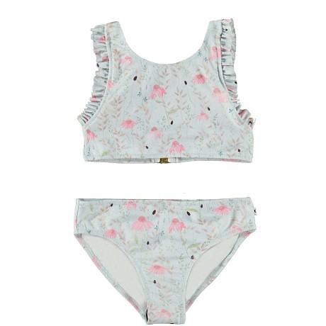 Двухпредметный купальник для девочки Molo – идеальный выбор для теплых дней! Изготовлен из 85% полиэстера и 15% эластана, с подкладкой из 85% нейлона и 15% эластана, он обеспечивает отличную посадку и комфорт. Купальник украшен нежным цветочным принтом на светло-сером фоне, что делает его идеальным для игр на пляже или в бассейне. На фото видны аккуратные оборки по краю, удобная застежка и мягкая текстура ткани. Качество от бренда из Дании и внимание к деталям делают этот купальник отличным выбором для вашего ребенка!