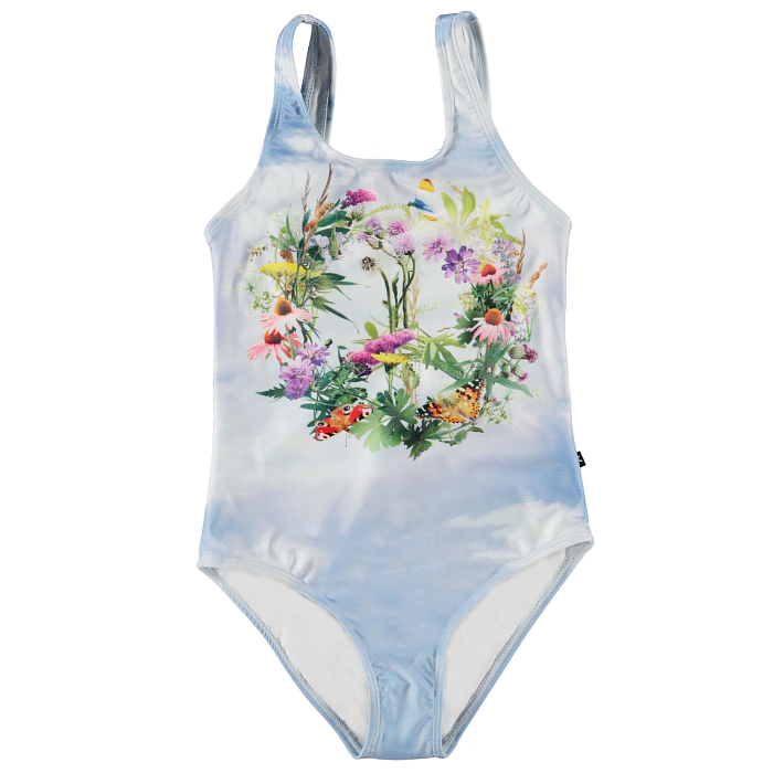 Цельнокроенный купальник Molo – это идеальный выбор для девочек! Изготовленный из 85% полиэстера и 15% эластана, он украшен очаровательным цветочным принтом с бабочками на фоне нежно-голубого неба. Купальник идеально подходит для девочек от 3 до 9 лет. На фотографиях видна аккуратная белая подкладка и мягкая текстура ткани. Качество от бренда из Дании и внимание к деталям делают этот купальник отличным выбором для вашего ребенка!