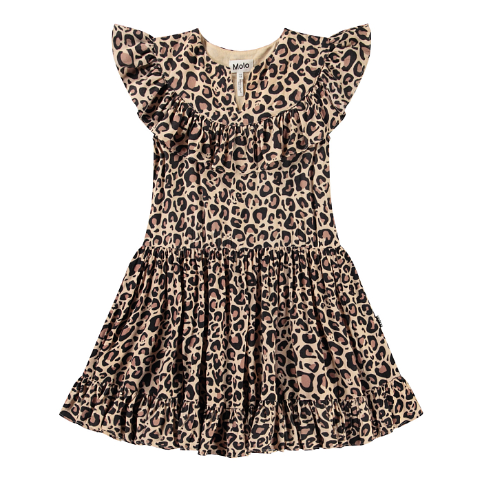 Платье для девочки Molo коричневого цвета с леопардовым принтом – это идеальный выбор для стильных и модных девочек! Изготовленное из 100% вискозы с подкладкой из 100% хлопка, оно идеально подойдет для теплых дней. Легкий леопардовый принт придает платью уникальность и модный вид. На фото видна аккуратная вискозная ткань с ярким леопардовым узором и мягкими оборками по краю. Качество от бренда из Дании и внимание к деталям делают эту модель отличным выбором для вашего ребенка!