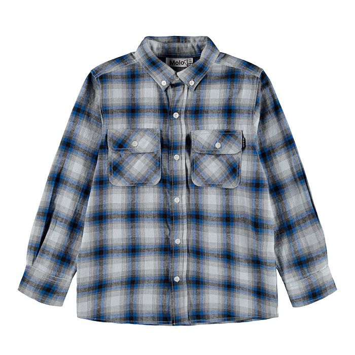 Рубашка для мальчиков Molo синего цвета с клеткой – это идеальный выбор для вашего ребенка! Изготовлена из 100% натурального хлопка, она обеспечивает комфорт и мягкость. Клетчатый принт в синих тонах придает рубашке оригинальный и модный вид. На фотографиях видны аккуратные карманы с белыми пуговицами и удобная застежка. Качество от бренда из Дании делает эту рубашку отличным выбором для вашего мальчика!
