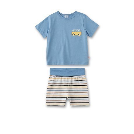 Пижама Sanetta – это идеальный выбор для мальчиков! Изготовленная из 100% натурального хлопка, она украшена ярким принтом автобуса и полосатыми шортами. Синий цвет создает ощущение спокойствия и уюта, а принт автобуса добавляет детской изюминки. На фотографиях видна удобная посадка и мягкая текстура ткани. Качество от бренда из Германии и внимание к деталям делают эту пижаму отличным выбором для вашего малыша!