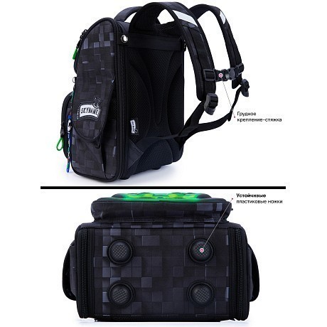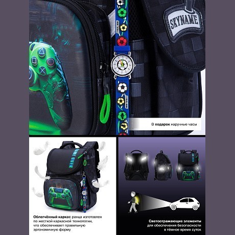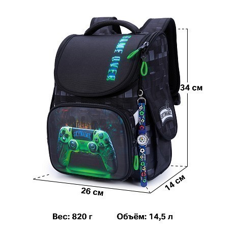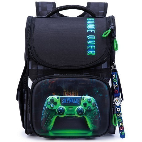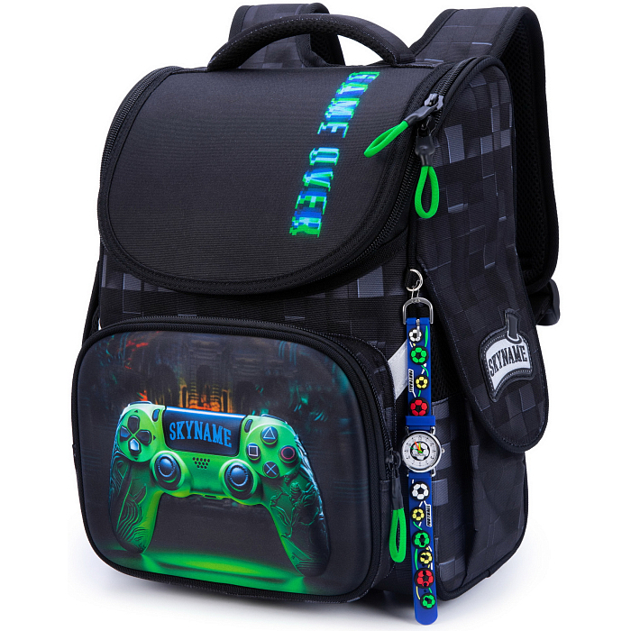 Ранец+часы SkyName – это идеальный выбор для юных геймеров! Изготовленный из 100% полиэстера, он украшен черным принтом контроллера и надписью "GAME OVER". Стильный дизайн в стиле видеоигр делает этот ранец не только практичным, но и очень модным. На фотографиях видна аккуратная черная окантовка по краю и мягкая текстура ткани. Качество от бренда из США и внимание к деталям делают эту модель отличным выбором для вашего ребенка!