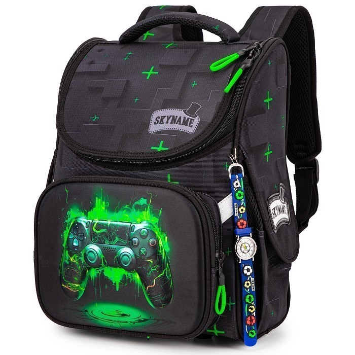 Ранец+часы SkyName – это идеальный выбор для мальчиков! Изготовленный из прочного материала 100% этиленвинилацетат/полиэстер, он украшен ярким дизайном игровой консоли с зелеными элементами и черным фоном. Надежная посадка обеспечивает комфортное ношение на все дни. Часы с удобной лентой в комплекте делают этот ранец еще более функциональным. Быстрая доставка СДЭК по всей России.