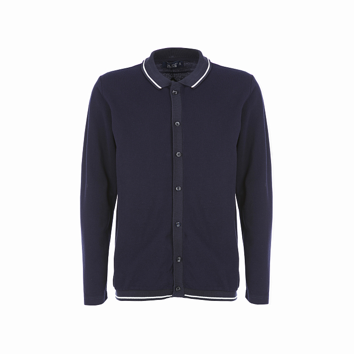 - 🎨 Дизайн: темно-синий цвет, белые вставки по краю воротника и рукавов, классический воротник, пуговицы