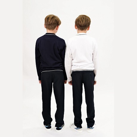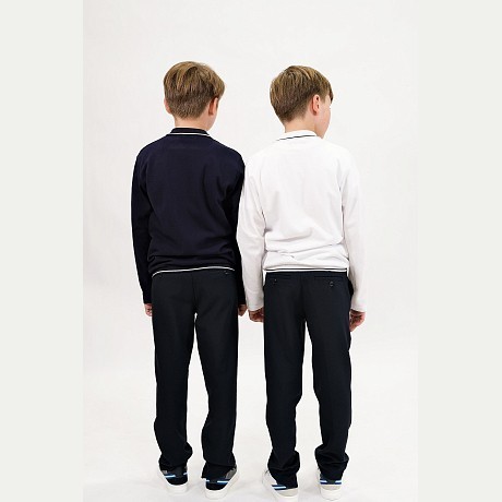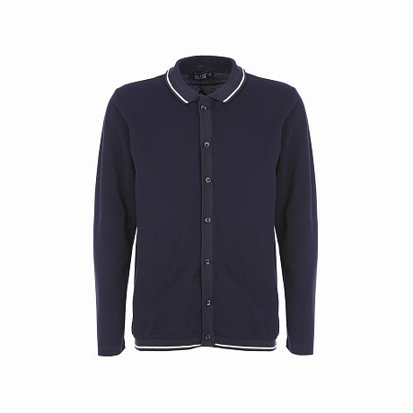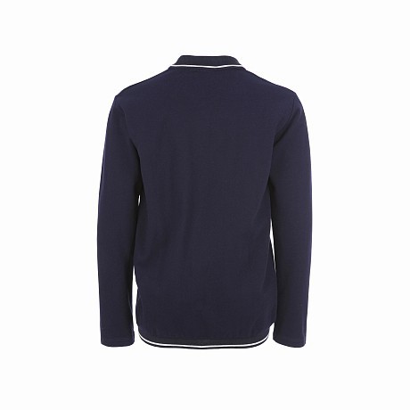 - 🎨 Дизайн: темно-синий цвет, белые вставки по краю воротника и рукавов, классический воротник, пуговицы