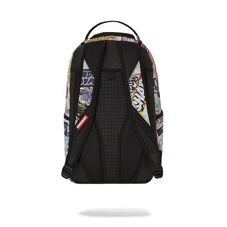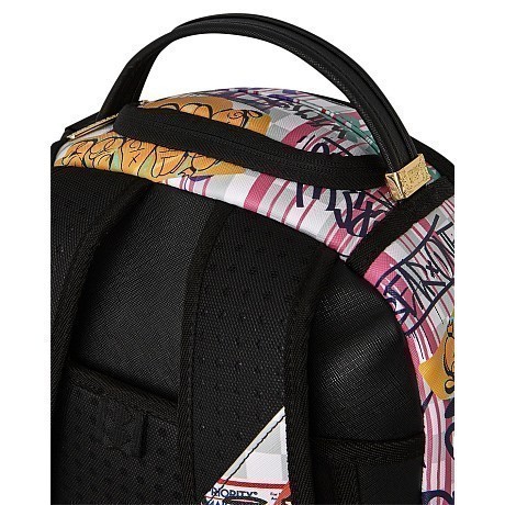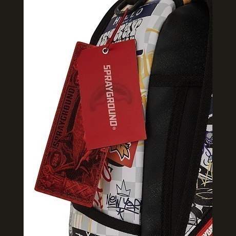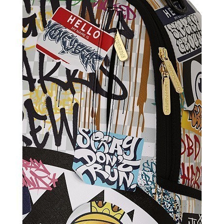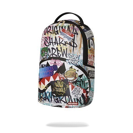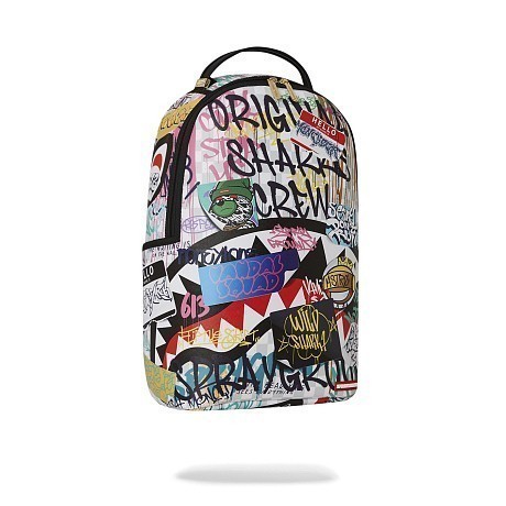 Рюкзак Sprayground – это идеальный выбор для девушек! Изготовлен из 100% поливинилхлорида с подкладкой из 100% полиэстера. Яркий граффити-дизайн с надписями "Original Shark Crew", "Hello" и другими элементами делает этот рюкзак не только функциональным, но и стильным. На фото видны яркие граффити-элементы, подкладка из полиэстера и удобная ручка для переноски.