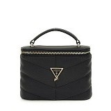 Черная сумка Guess – это идеальный выбор для создания элегантного образа! Выполнена из качественного полиуретана с характерной стеганой фактурой, которая придает изделию объем и премиальный вид. Сверху расположена удобная жесткая ручка для переноски и надежная молния, а в центре сияет узнаваемый золотой логотип бренда. Отличный выбор для игр, походов в театр или как стильная косметичка!