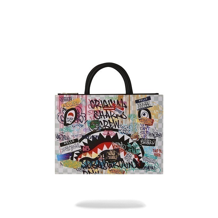 Сумка Sprayground – это идеальный аксессуар для женщин! Изготовленная из 100% поливинилхлорида, она украшена ярким принтом и граффити. Светло-серый фон с разноцветными надписями и рисунками создает современный и необычный стиль. На фотографиях видны черные ручки и контрастные надписи, которые добавляют сумке уникальности. Качество от бренда из США делает эту сумку отличным выбором для модных девушек!