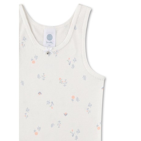 Молочная майка Sanetta – это идеальный выбор для девочек! Изготовленная из 100% хлопка, она украшена нежным цветочным принтом в виде маленьких розовых и голубых цветочков на молочном фоне. Мягкая и приятная на ощупь ткань создает комфорт и уют для вашего ребенка. На фото видна аккуратная белая окантовка по краю и удобная круглая горловина. Качество от бренда из Германии и внимание к деталям делают эту майку отличным выбором для вашего девочки!