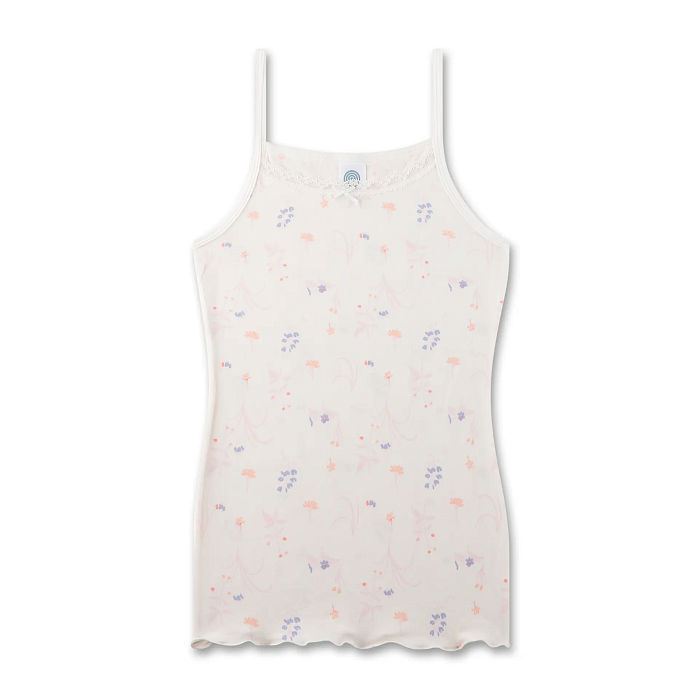 Молочная майка Sanetta с нежным цветочным принтом – идеальный выбор для вашего ребенка! Изготовлена из 46% хлопка, 46% модала и 8% эластана, что делает её мягкой, эластичной и идеально подходящей для нежной кожи. Нежные цветы и листья в нежных оттенках создают нежное и романтичное настроение. На фото видна аккуратная кружевная отделка по краю и удобная посадка. Качество от бренда Sanetta и внимание к деталям делают эту майку отличным выбором для вашего ребенка!