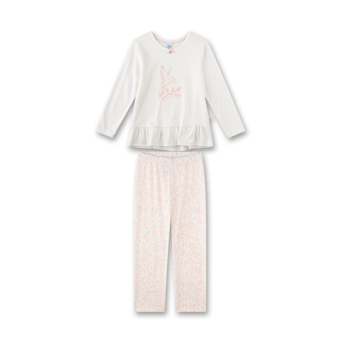 Пижама Sanetta – это идеальный выбор для маленьких принцесс! Изготовленная из 50% хлопка и 50% модала, она украшена очаровательным рисунком птицы на молочном фоне. Нежная ткань с эластичной резинкой на талии обеспечивает комфортную посадку и удобство в использовании. На фотографиях видна аккуратная резинка по краю и мягкая текстура ткани. Качество от бренда из Германии и внимание к деталям делают эту пижаму отличным выбором для вашего ребенка!