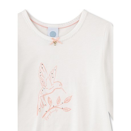 Пижама Sanetta – это идеальный выбор для маленьких принцесс! Изготовленная из 50% хлопка и 50% модала, она украшена очаровательным рисунком птицы на молочном фоне. Нежная ткань с эластичной резинкой на талии обеспечивает комфортную посадку и удобство в использовании. На фотографиях видна аккуратная резинка по краю и мягкая текстура ткани. Качество от бренда из Германии и внимание к деталям делают эту пижаму отличным выбором для вашего ребенка!
