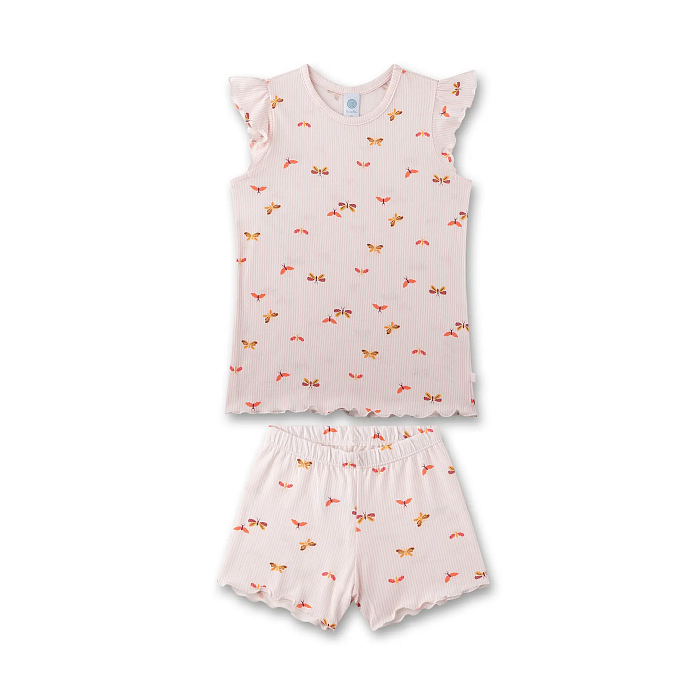 Пижама для девочек Sanetta бледно-розовая с мелкими бабочками – это идеальный выбор для теплых летних вечеров! Изготовленная из 50% хлопка и 50% модала, она обеспечивает мягкость и комфорт для вашей дочурки. Белоснежная основа с нежными бабочками в тонкие полоски создает легкое и приятное настроение. На фотографиях видны аккуратные воланы на рукавах и по краю, а также эластичная резинка на талии. Качество от бренда Sanetta и внимание к деталям делают эту пижаму отличным выбором для вашего ребенка!