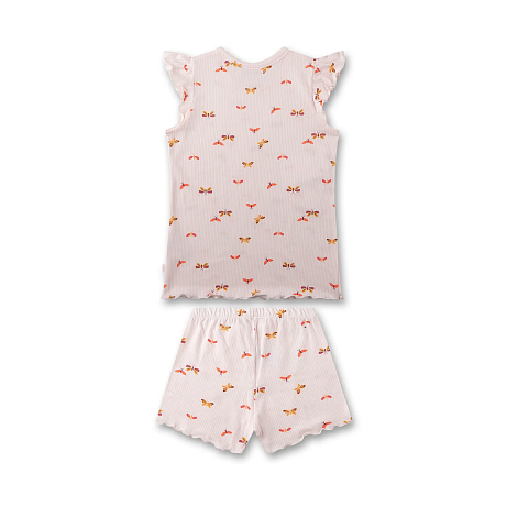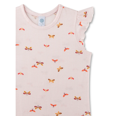 Пижама для девочек Sanetta бледно-розовая с мелкими бабочками – это идеальный выбор для теплых летних вечеров! Изготовленная из 50% хлопка и 50% модала, она обеспечивает мягкость и комфорт для вашей дочурки. Белоснежная основа с нежными бабочками в тонкие полоски создает легкое и приятное настроение. На фотографиях видны аккуратные воланы на рукавах и по краю, а также эластичная резинка на талии. Качество от бренда Sanetta и внимание к деталям делают эту пижаму отличным выбором для вашего ребенка!
