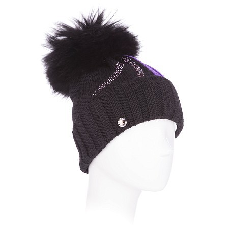 Шапка для девочки черная с фиолетовым и меховым помпоном