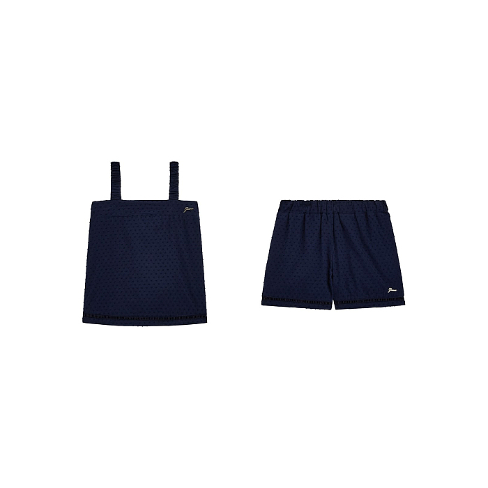 Комплект блузка топ+шорты Guess – это идеальный выбор для девочек! Изготовленный из 100% хлопка, он выполнен в темно-синем цвете с мелкими белыми точками. Блузка топ с регулируемыми бретелями и эластичной талией, шорты с эластичной резинкой. Нежная ткань и удобная посадка делают этот комплект идеальным для активного отдыха и повседневной носки. На фотографиях видна аккуратная белая точечная текстура ткани, мягкая и приятная на ощупь. Качество от бренда из США и внимание к деталям делают этот комплект отличным выбором для вашего ребенка!