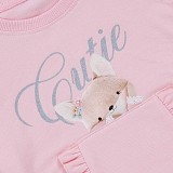 - 🎨 Дизайн: 3D-зайка в кармане с рюшками, надпись "Cutie", брюки в стиле пэчворк