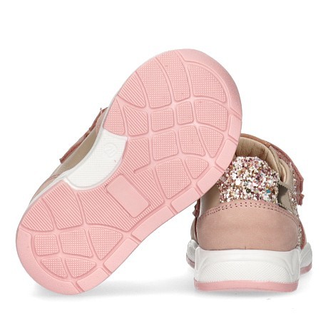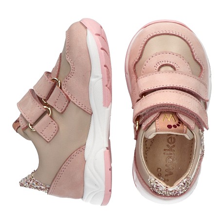 Кроссовки для девочки Walkey бледно-розовые с золотыми звездами и сердечками – это идеальный выбор для маленьких модниц! Изготовлены из натуральной кожи с подкладкой из искусственной кожи и термопластичной резины, они обеспечивают комфорт и долговечность. Бледно-розовый цвет с золотыми акцентами создает нежный и стильный образ. На фотографиях видны золотые звезды и сердечки на передней части кроссовок, а также мягкая подкладка и удобные липучки. Качество и стиль от итальянского бренда Walkey делают эти кроссовки отличным выбором для вашего ребенка!