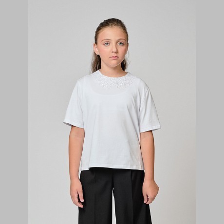 Белая трикотажная блузка Андерсен – идеальный выбор для школьников! Изготовлена из 92% хлопка и 8% эластана, она дополнена кружевной отделкой на горловине, что придает блузке нежность и элегантность. Белый цвет блузки подчеркивает её универсальность, а кружево добавляет нотку романтики. На фотографии видна аккуратная кружевная отделка по горловине и мягкая текстура ткани. Качество от бренда из Дании делает эту блузку отличным выбором для вашего ребенка!