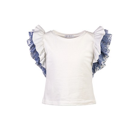 Белая трикотажная блузка Elsy – это идеальный выбор для девочек! Изготовленная из 95% хлопка и 5% эластана, она дополнена стильной отделкой из 100% полиэстера. Блузка украшена рюшами и принтом, который придает ей нежный и элегантный вид. На фотографиях видна аккуратная отделка на рукавах и мягкая текстура ткани. Качество от итальянского бренда Elsy и внимание к деталям делают эту блузку отличным выбором для вашего ребенка!