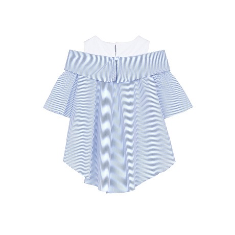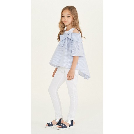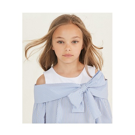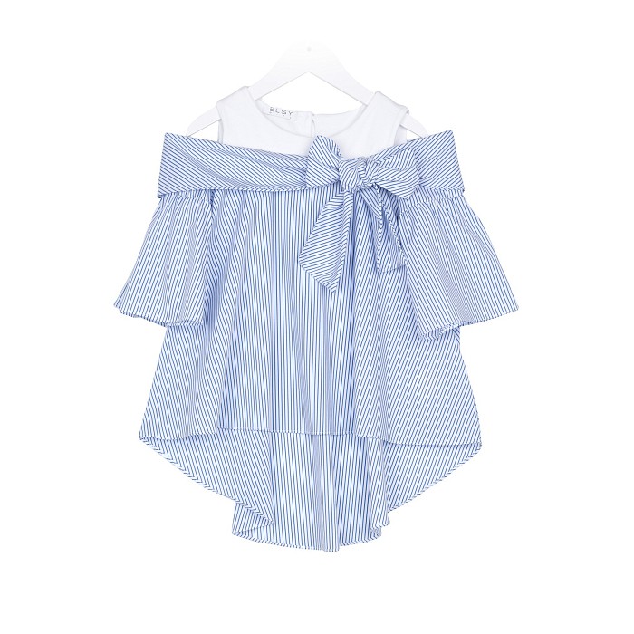 Блуза для девочек Elsy – это идеальный выбор для маленьких модниц! Изготовленная из 72% хлопка, 25% полиамид и 3% эластан, она обеспечивает отличную посадку и комфорт. Блуза с открытыми плечами и бантом на груди создает элегантный и уютный образ. Белый фон с синими полосками придает блузке легкость и свежесть. На фото видна аккуратная отделка по краю и мягкая текстура ткани. Качество от итальянского бренда Elsy и внимание к деталям делают эту блузку отличным выбором для вашего ребенка!
