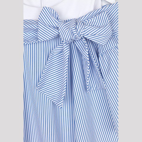 - 🎨 Дизайн: открытыми плечами, бантом, белый фон с синими полосками