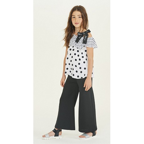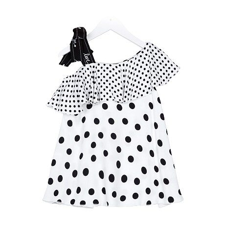 Блуза Elsy – это идеальный выбор для маленьких модниц! Изготовленная из 100% вискозы, она украшена очаровательным принтом черных горохов и оборкой на плечах. Нежная белая основа с черными горохами и оборками создает стильный и в то же время уютный образ. На фотографии видна аккуратная черная оборка на плечах и элегантный принт горохов. Качество от бренда из Италии и внимание к деталям делают эту блузу отличным выбором для вашего ребенка!